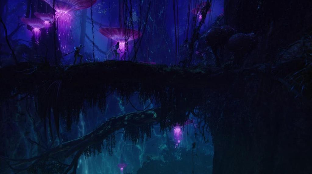 Les deux films jouent de ces effets de renvoi et de ce jeu d’indices tout en déplaçant l’action et le contexte géographique. Là où le western tel que l’imaginaient John Ford, Anthony Mann ou John Huston fait un usage très radical de la planéité des espaces et se sert de la profondeur de champ pour démarquer le personnage du fond, là où le western classique est associé à une définition claire de la ligne d’horizon, en particulier quand il a lieu dans l’Ouest ou le Sud des États-Unis, Avatar, tout en épousant une structure largement identifiable (le film a souvent été rapproché de Danse avec les loups (Dances with wolves, Kevin Costner, 1990), réinvente le décor, conçu non plus dans une logique de planéité mais par le biais du foisonnement dans Avatar et de l’épaisseur dans The Way of water. La densité de la forêt de Pandora, dont la forme renvoie davantage à une jungle tropicale qu’à un paysage d’Amérique du Nord, et l’omniprésence de l’eau dans le deuxième film nient chacune à leur manière la prépondérance du plan d’ensemble. Les plans de The way of water que James Cameron semble avoir conçus pour être magistraux, pour détoner dans le cours du récit, jouent d’un rapport nouveau à l’arrière plan. Ainsi, lorsque Loak nage pour la première fois avec le tulkun Payakan, un plan montre les deux corps unis par une contre-plongée si prononcée qu’elle fonctionne en miroir avec le plan zénithal. L’eau qui environne les deux personnages n’offre aucune ligne d’horizon, aucune ligne de fuite et seul le miroitement du soleil en fond et la densité des bleus (plus ou moins clairs, presque noirs en ce qui concerne les deux silhouettes) permettent au plan d’exister en volume. Ce n’est pas, comme dans la syntaxe hollywoodienne classique, la composition du plan qui lui donne sa valeur tri-dimentionnelle mais, en plus de la technologie 3D utilisée, les effets lumineux et organiques de l’image.