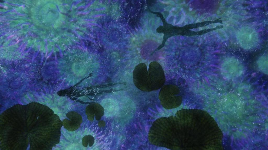 Notons la puissance chromatique du paysage, dont le trait principal est sa teinte bleutée mais qui comprend une grande variété de tons verts, rose, violets, gris… L’omniprésence du bleu, qu’il soit terrestre dans le premier film ou marin dans le deuxième, organise la forme englobante du paysage et corrobore l’idée d’une fonction environnementale de ce dernier, devenu une matière fluide. La réactivité de cette matière, par la luminescence des organismes de la forêt ou la réflection des astres sur le tissu aqueux, confère à cet espace plastique une épaisseur spirituelle.