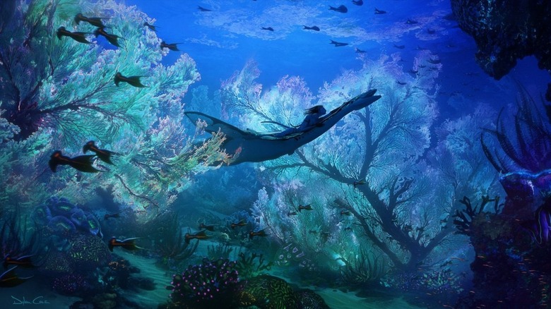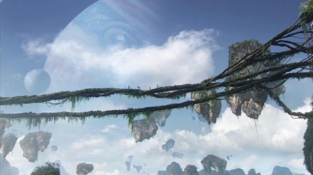 Quand les na’avis adolescents contemplent le récif flottant dans les airs, la lévitation des îlots empêche à l’horizon attendu d’exister pleinement.
